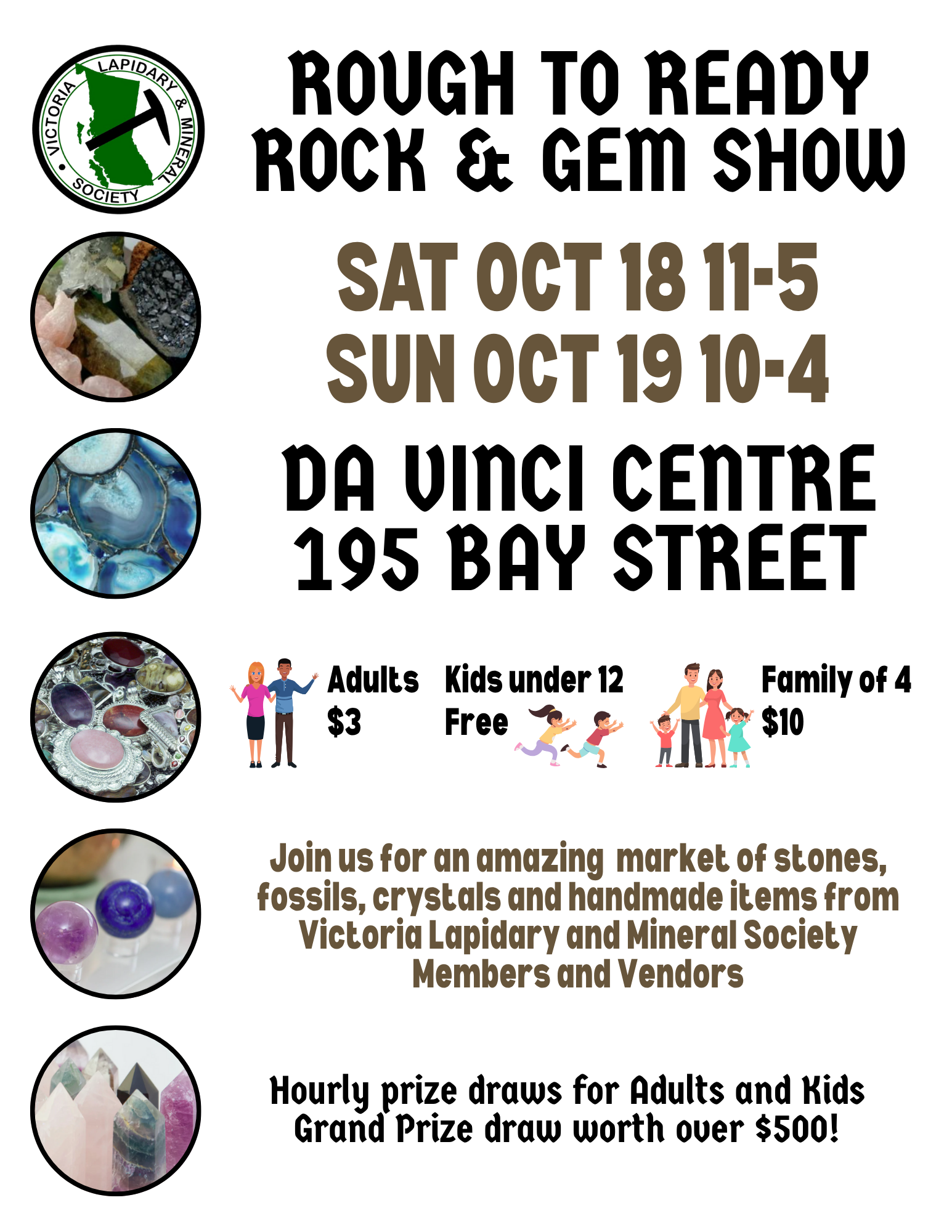 The Rough 2 Ready show features a variety of vendors that offer everything from locally collected rocks to created items, collectable items, jewelry and crystal collections. We have hourly door prizes for adults and children and a very special Grand Prize draw worth over $500!