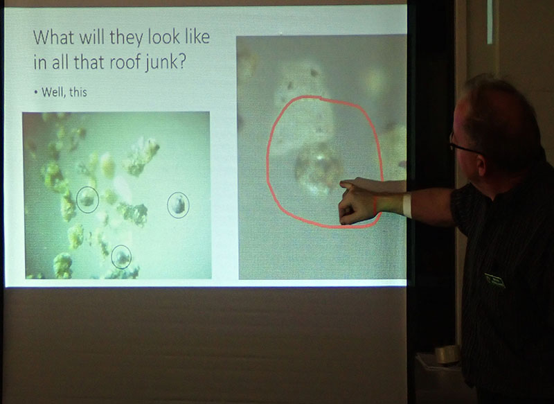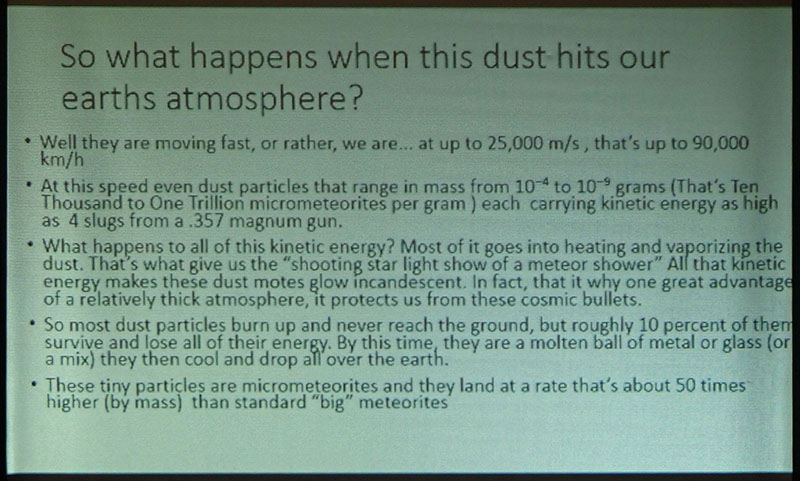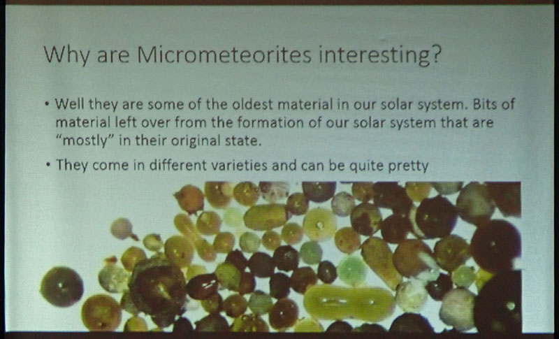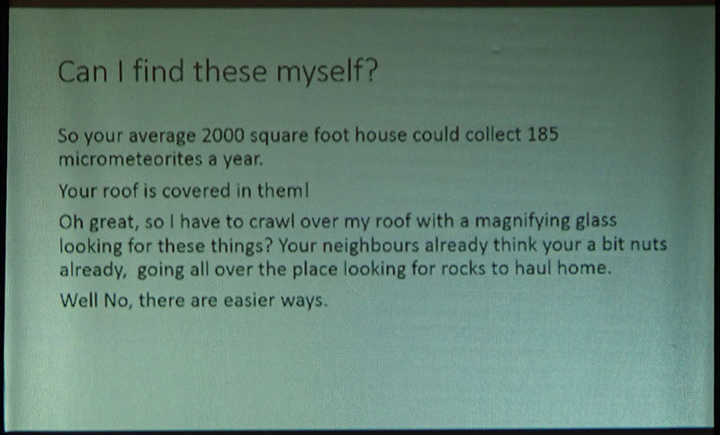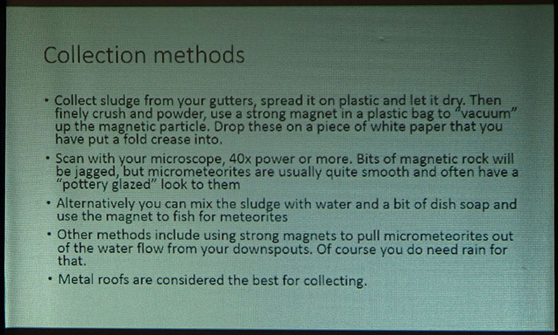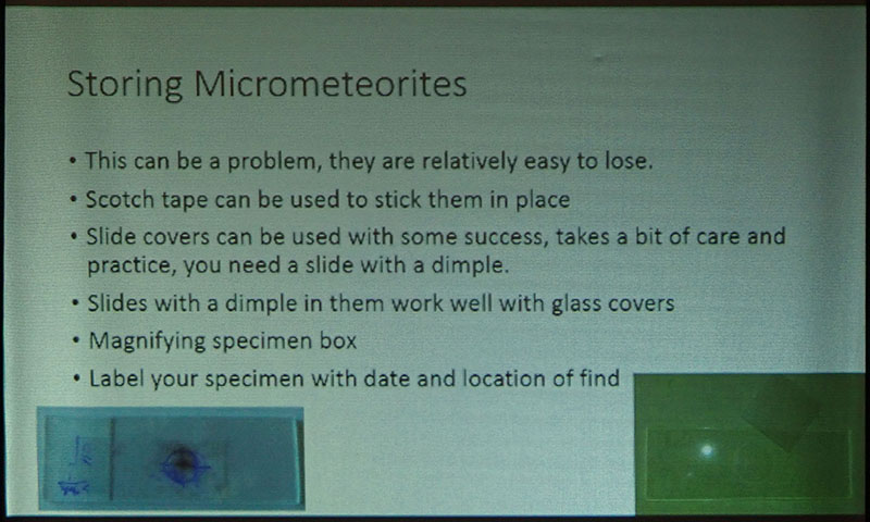 His talk covered several ingenious methods for collecting micrometeorites at home, how to identify them once collected and how to store them.  As a complementary display, Leni Gagnon brought some of her meteorite specimen collection.