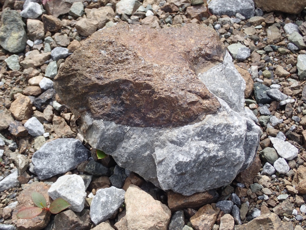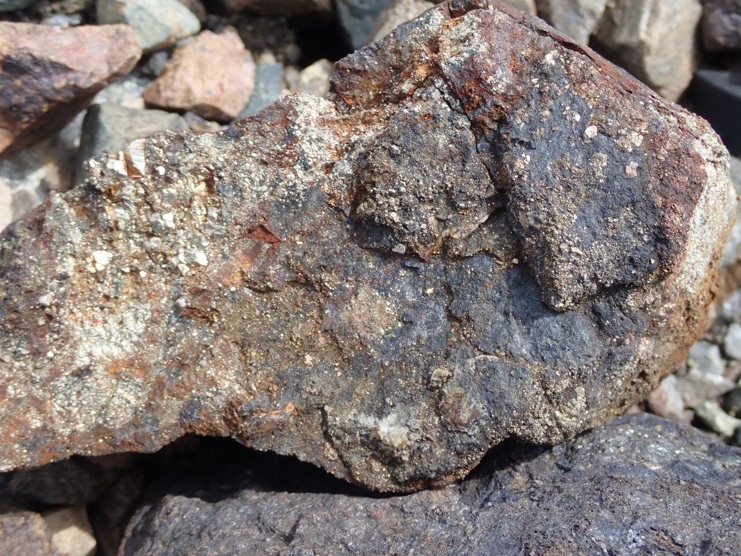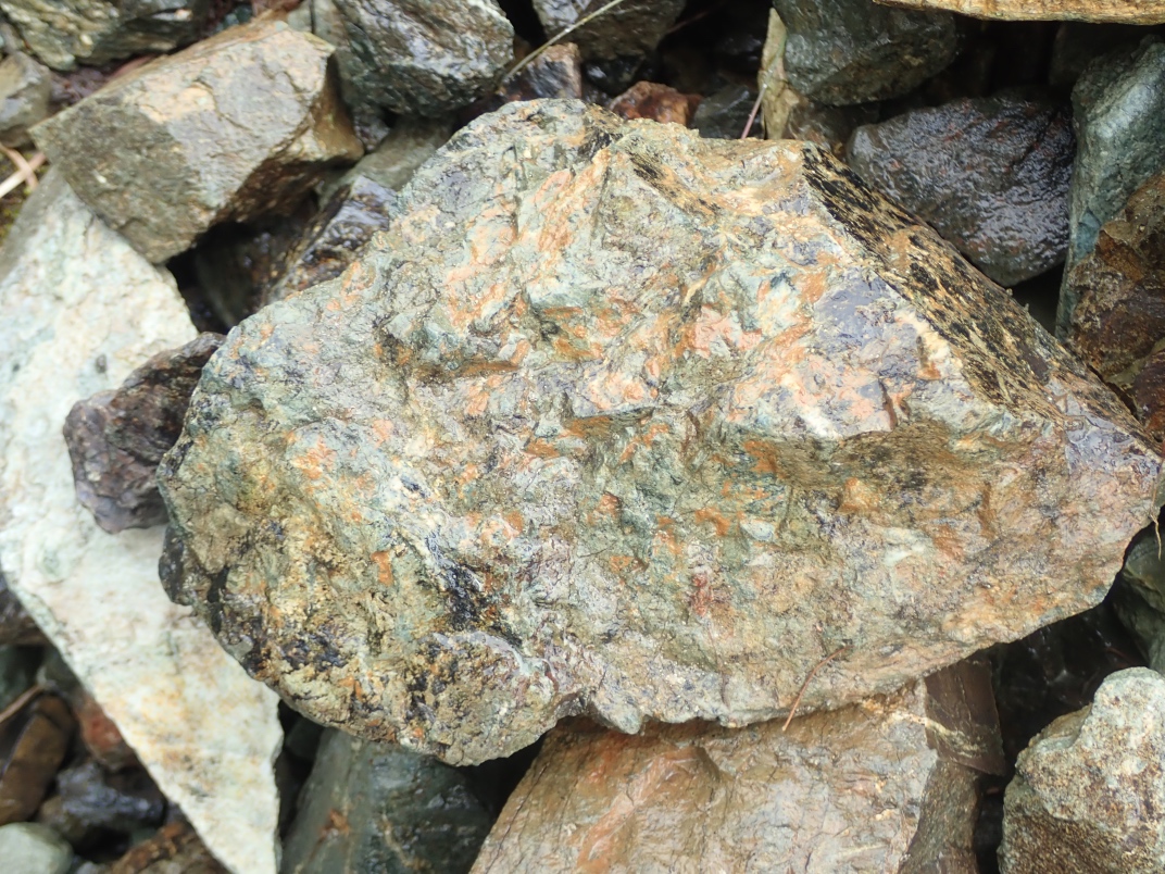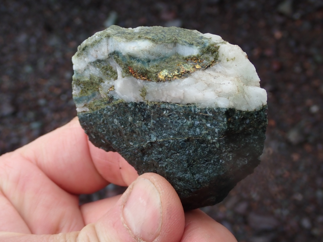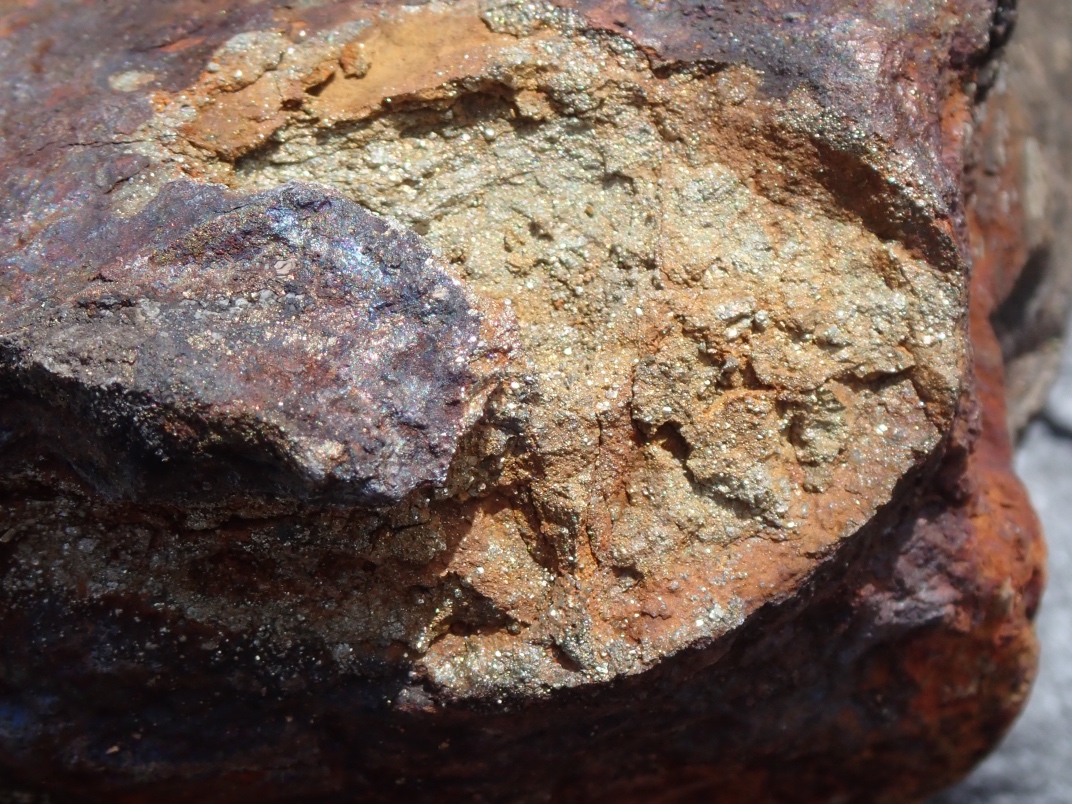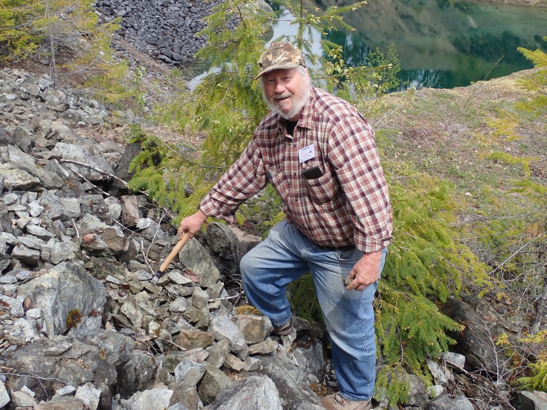 The Argonaut mine is an idle open pit iron mine. Active from 1951 until 1957 its minerals were used in the steel manufacturing industry. Minerals to be found are magnetite, garnet skarn, epidote skarn, calcite, marble, pyrite, limestone, diorite and actinolite. The trip was led by Jim McKinnon (Parksville club) who provided good interpretation of what was available and how to find it.