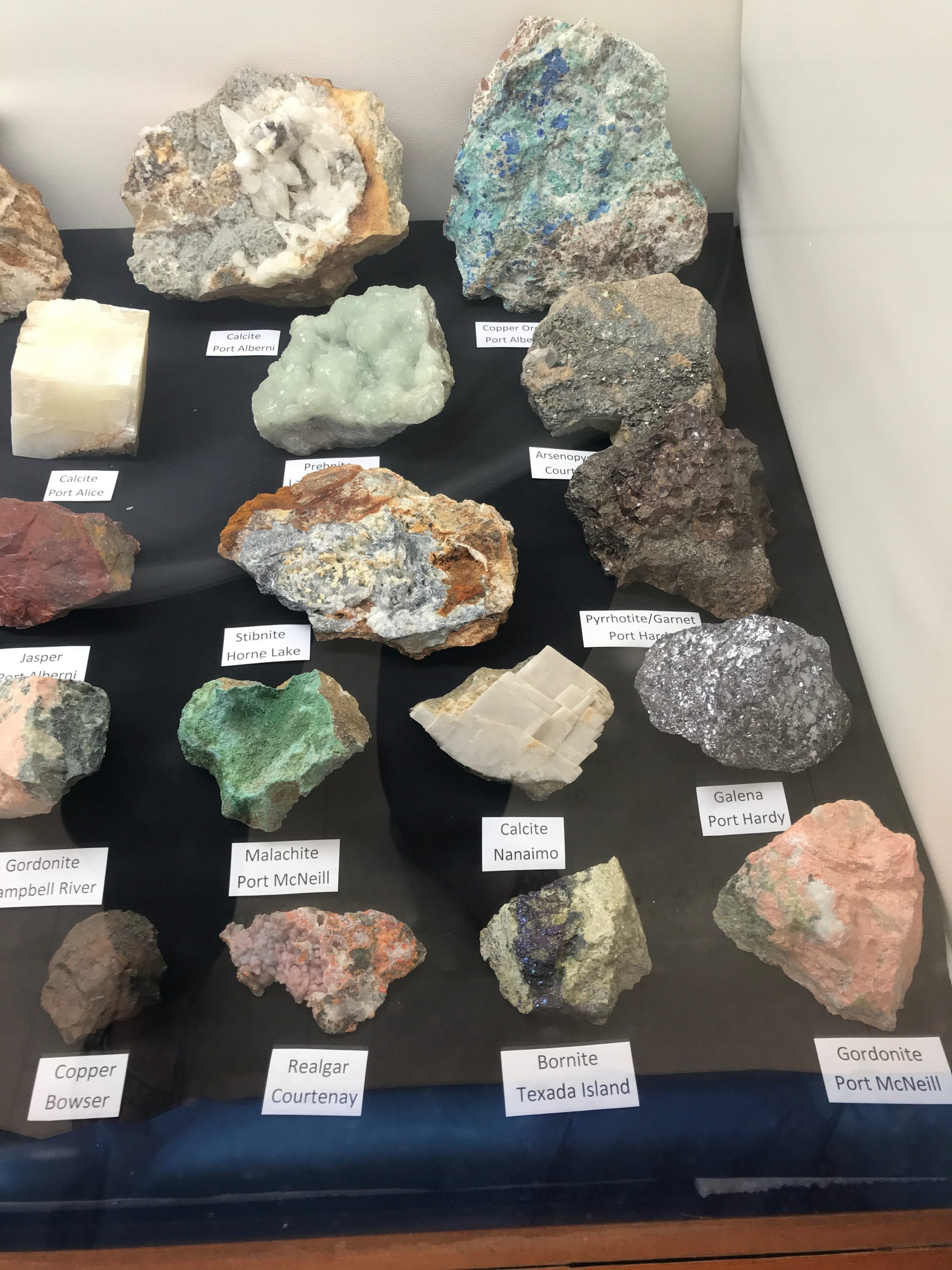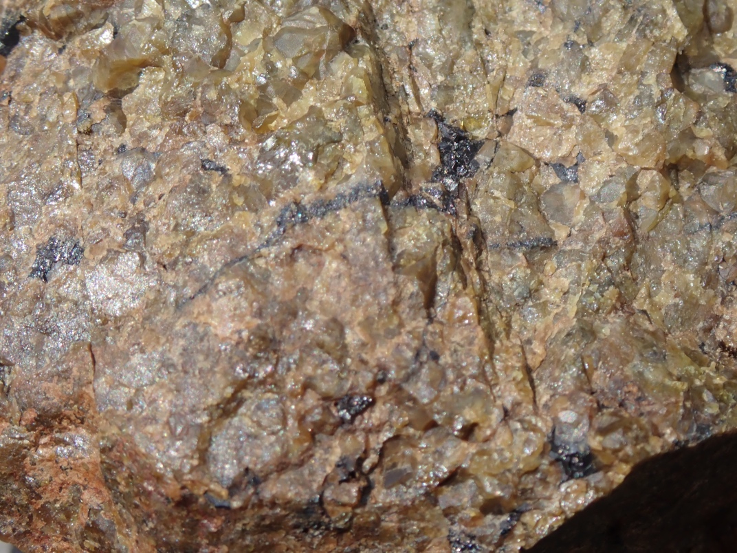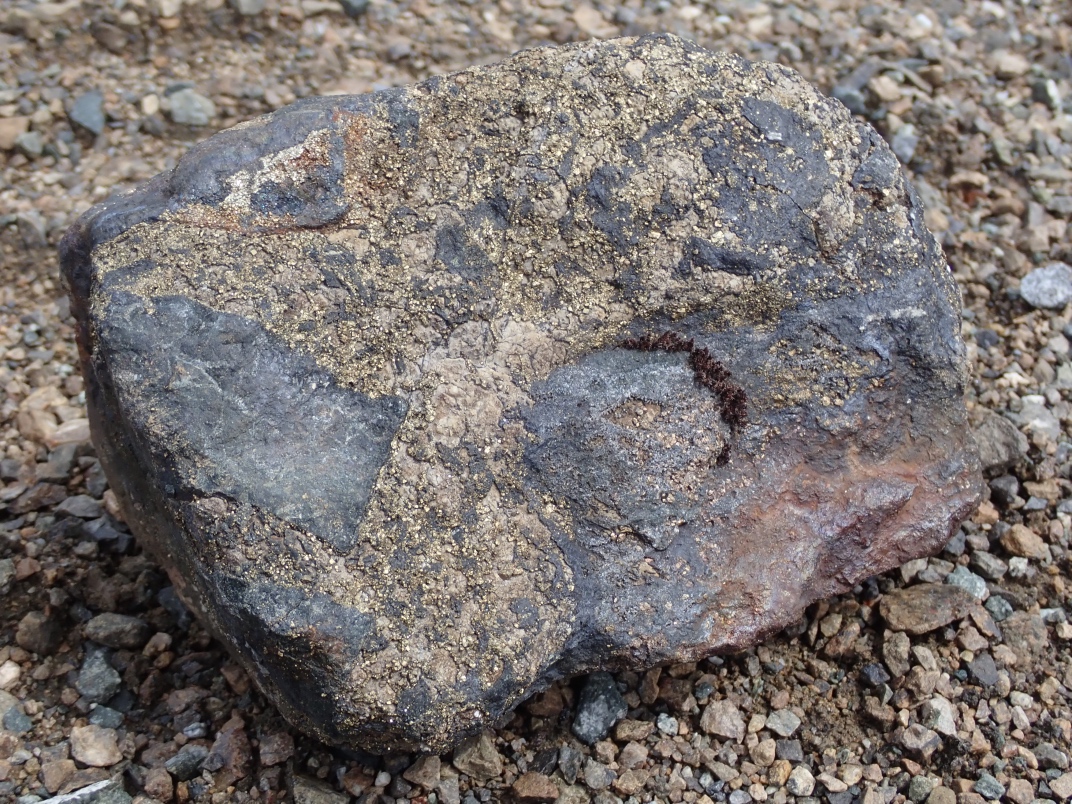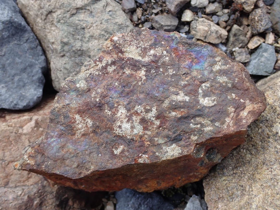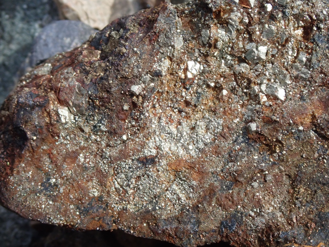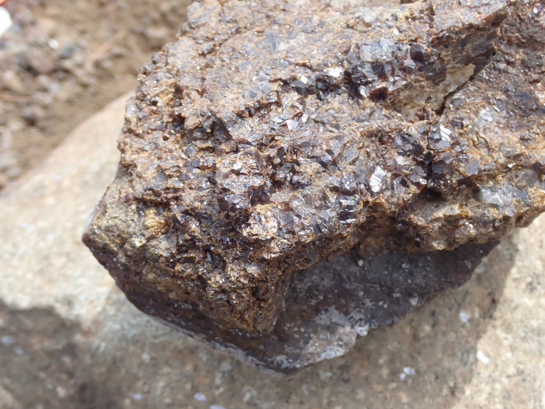 The Argonaut mine is an idle open pit iron mine. Active from 1951 until 1957 its minerals were used in the steel manufacturing industry. Minerals to be found are magnetite, garnet skarn, epidote skarn, calcite, marble, pyrite, limestone, diorite and actinolite. The trip was led by Jim McKinnon (Parksville club) who provided good interpretation of what was available and how to find it.