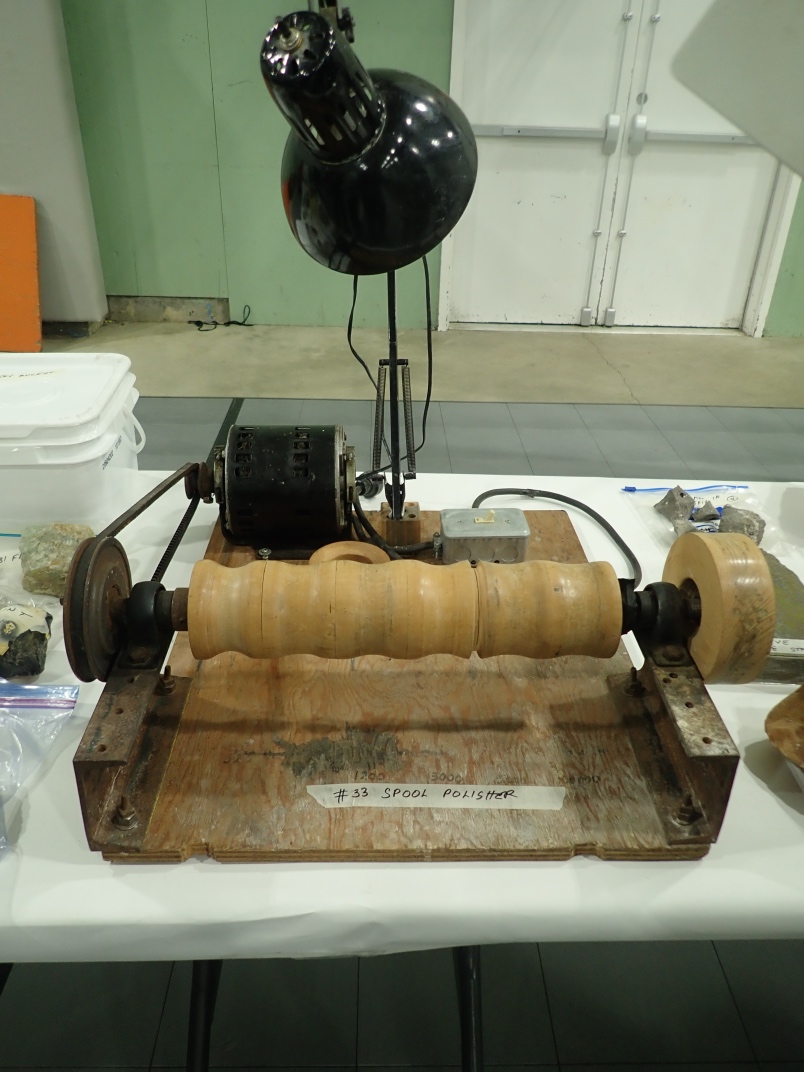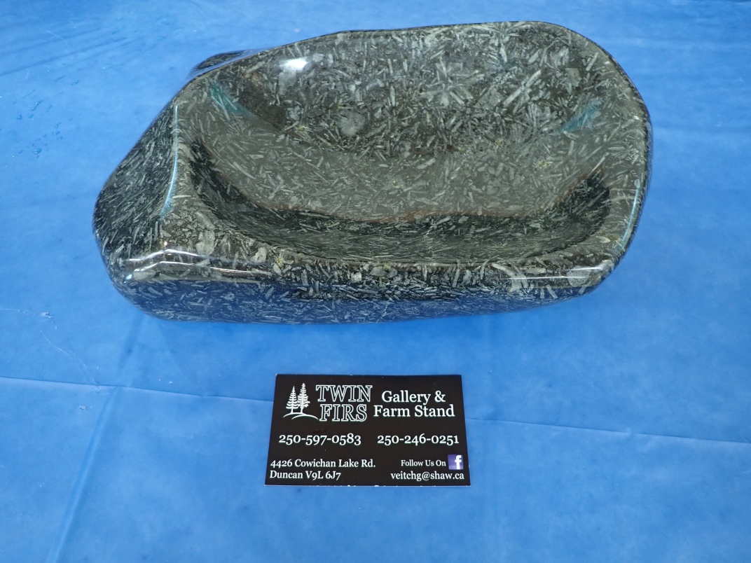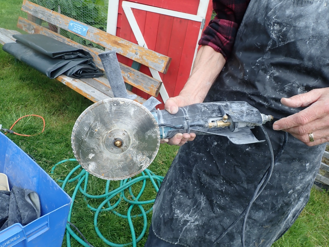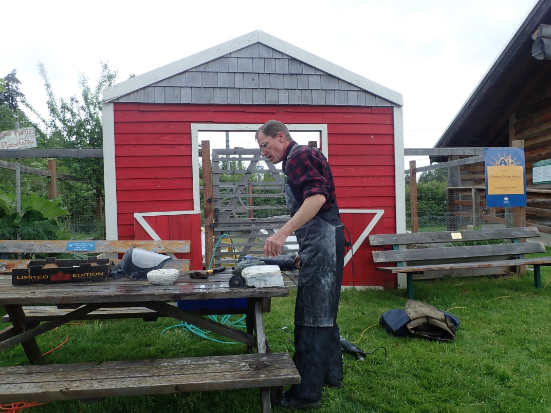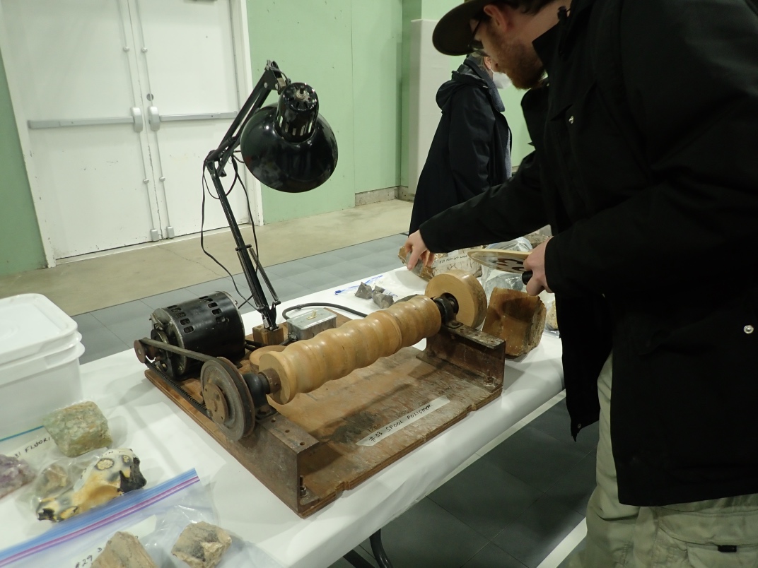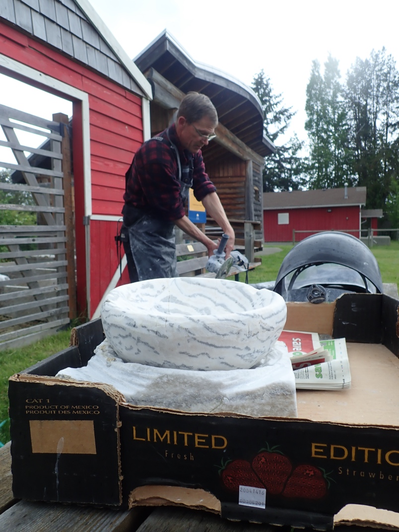 Gary Veitch from the Duncan club demonstrated how he carves rock bowls. He uses a Makita Wet Stone polisher that he has modified to keep the powdered rock out of the workings. Gary shapes and sands the outside before starting on the inside. It takes a couple of days to produce a finished bowl from a rock.